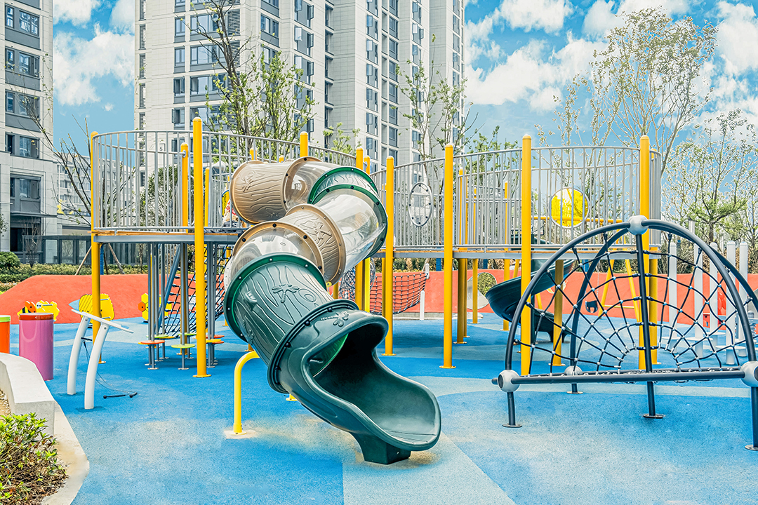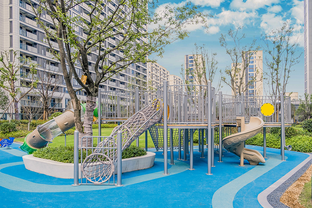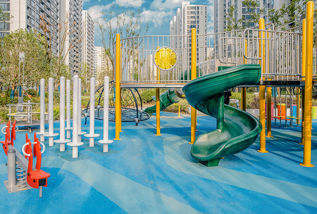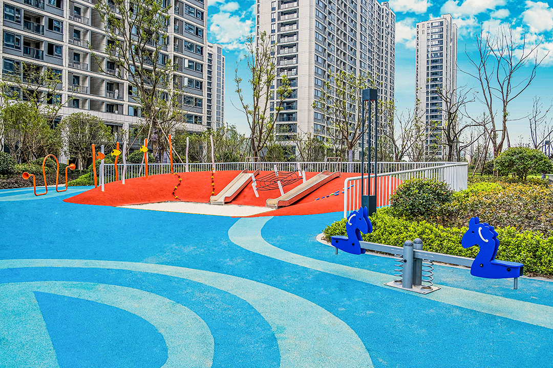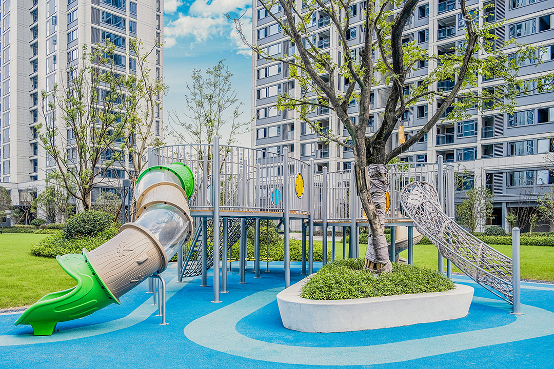 项目位于浙江省杭州市富阳区秦望小区。飞鲸游乐设计团队以为儿童创造出良好的游乐玩耍环境作为出发点,从材料、色彩、形态等去做设计,在儿童玩耍的同时以培养他们的美好情操,陶冶心灵,融入自然,寓教于乐。色彩上我们选用了鲜艳明快的颜色,用以区分不同的空间领域,场地通过不规则的铺装变化,在整个景观设计相协调的基础上突出特色,调动儿童的积极性,增加了游玩的乐趣。整体设计以未来儿童的真实需求为设计出发点,打造出了一个充满童趣的儿童游乐空间,为周边居民提供了一个遛娃好去处。