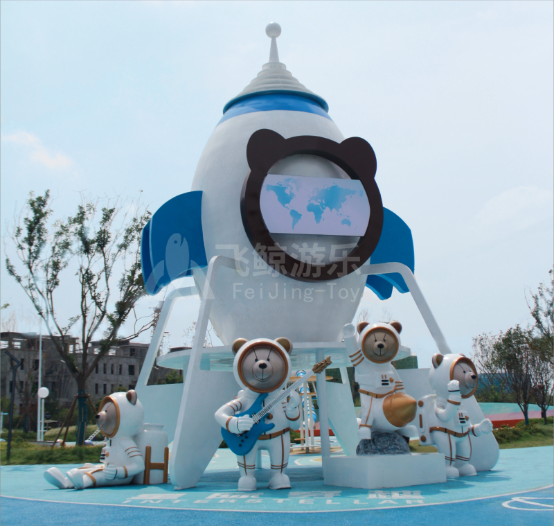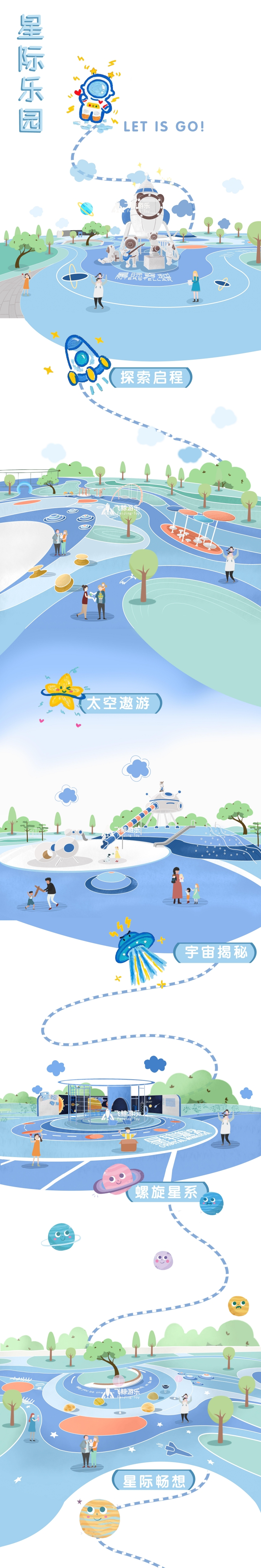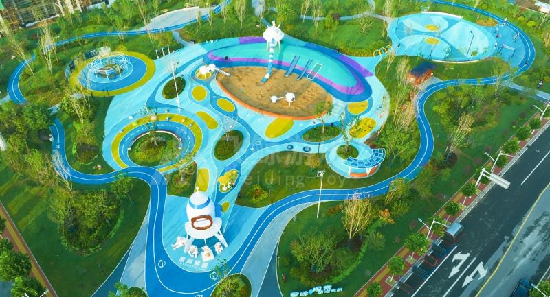 本次设计以“星际穿越”为主题,场地宽阔,玩法丰富,地标式的小熊火箭、飞船登陆与星系共同构筑了一幅科幻、冒险的星际画卷,吸引小朋友大朋友前来探索。乐园集结“观光、游憩、运动以游乐及绿意生态”等多种功能,多元化的活动空间,让亲子陪伴体验多种快乐,也为市民提供更好的户外空间。